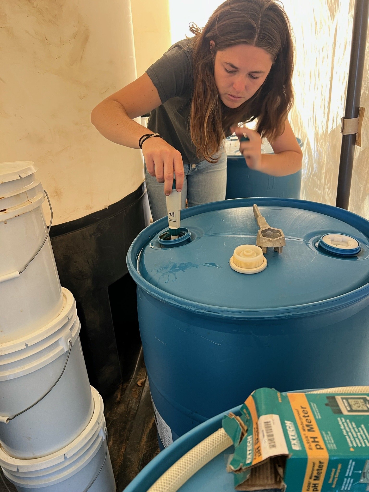 Sydney being our resident scientist and making sure the pH of our microbial cultures is where we want it to be to start adding it to our plants.